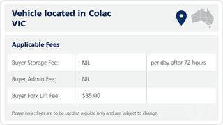 BID NOW ONLINE AUCTION Catalogue & images are a guide only. Please inspect images online to make your own determinations. Payment due within 24hrs. Storage fees may apply after 48hrs. Late Payment feeof $121 will be added if not paid on time. Forklift fees mayapply. Vehicles may not include keys/books. All vehicles sold unregistered unless advised. No guarantee on mechanicalcondition.