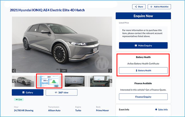 If the vendor or a buyer has chosen to have the vehicle tested, they will be shown in the photo gallery and can be viewed by clicking the “Battery Health” button on the vehicle details page. We currently have testing units located at our Melbourne, Sydney and Brisbane facilities and other sites will be enabled soon. There may be some, usually older, EVs that are not supported by AVILOO’s testing equipment and other circumstances may prevent us from displaying battery SoH information for every EV.