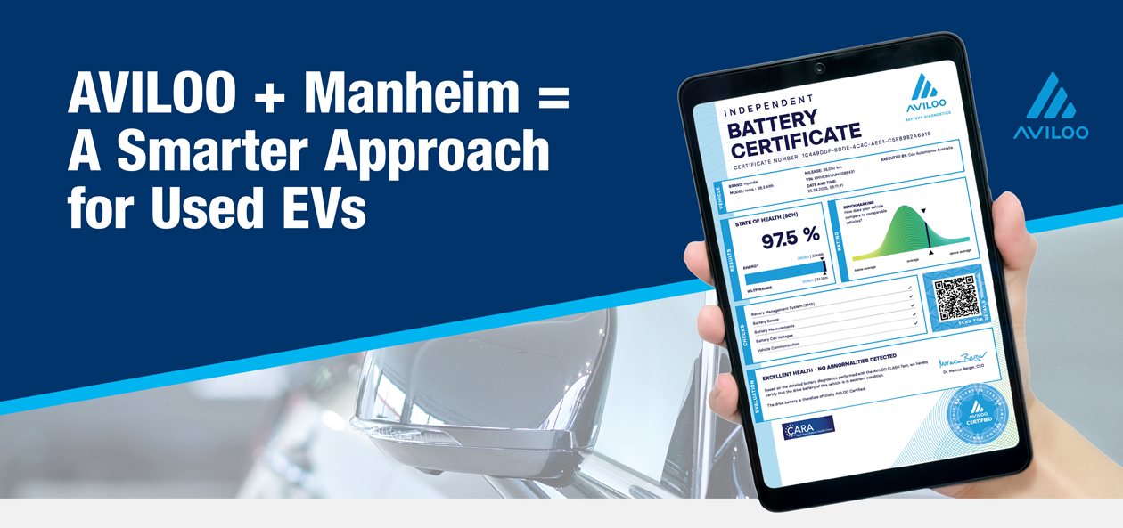 Boost trust & drive value with AVILOO Battery State of Health Tests at Manheim. AVILOO battery test certificates provide tangible benefits for Dealers looking to wholesale EV trade-ins through Manheim, or source premium EV used stock from Manheim auctions for your Used Vehicle Operations.